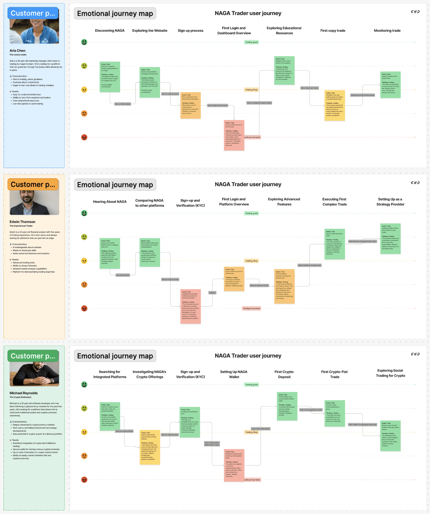 To understand how people use NAGA, we made user journey maps. This showed us important steps, problems users face, and ways to make things better. We made maps for three main user types: new traders, experienced traders, and crypto fans. Each map shows seven steps from finding NAGA to using it regularly.