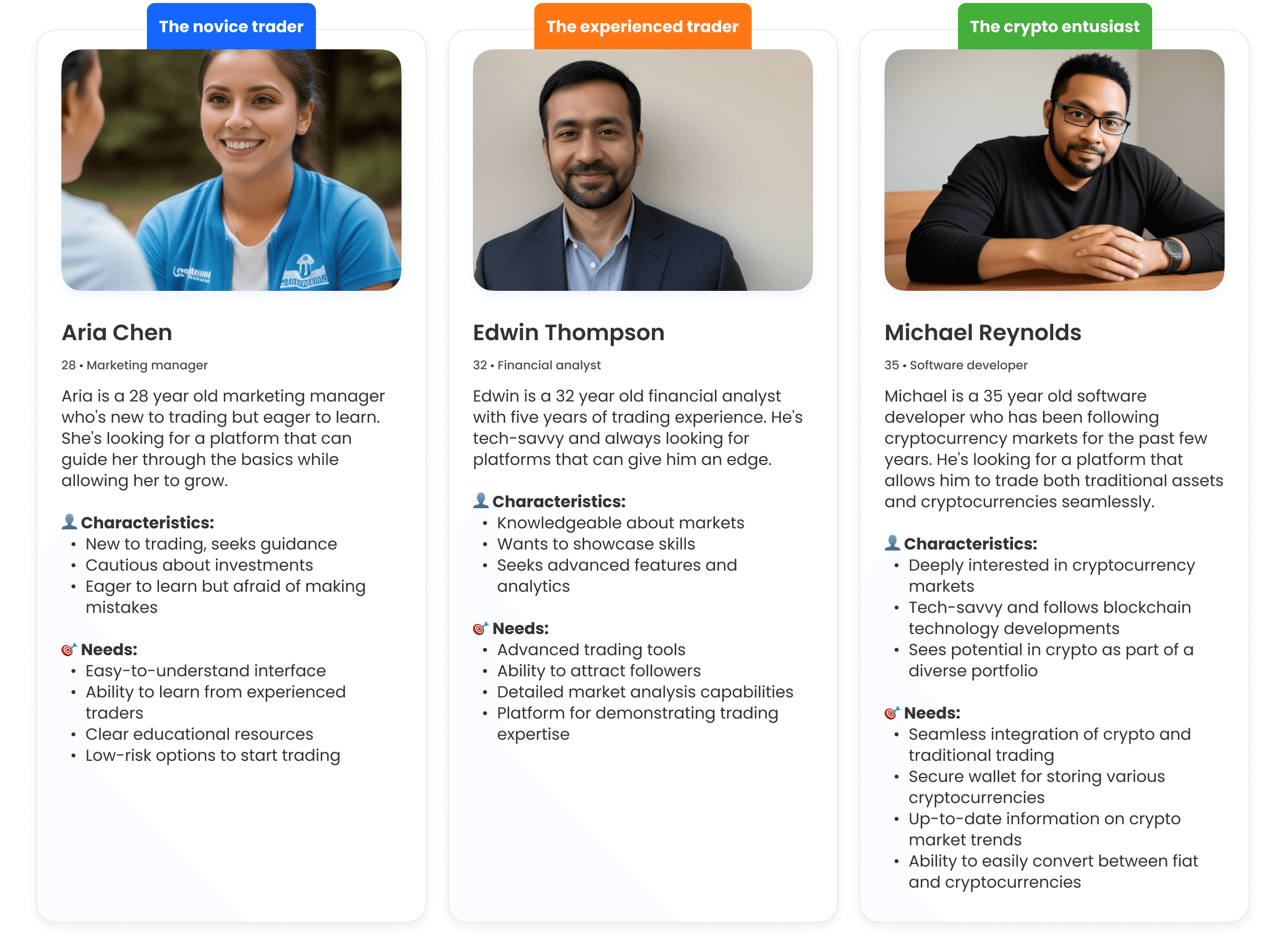 To guide our design process, we developed three user personas that represent key segments of our audience.